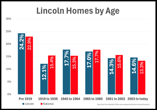 Lincoln has 44,581 homes, according to the Valuation Office. Breaking them down by period built reveals a pattern that becomes even more interesting when compared to the national picture.