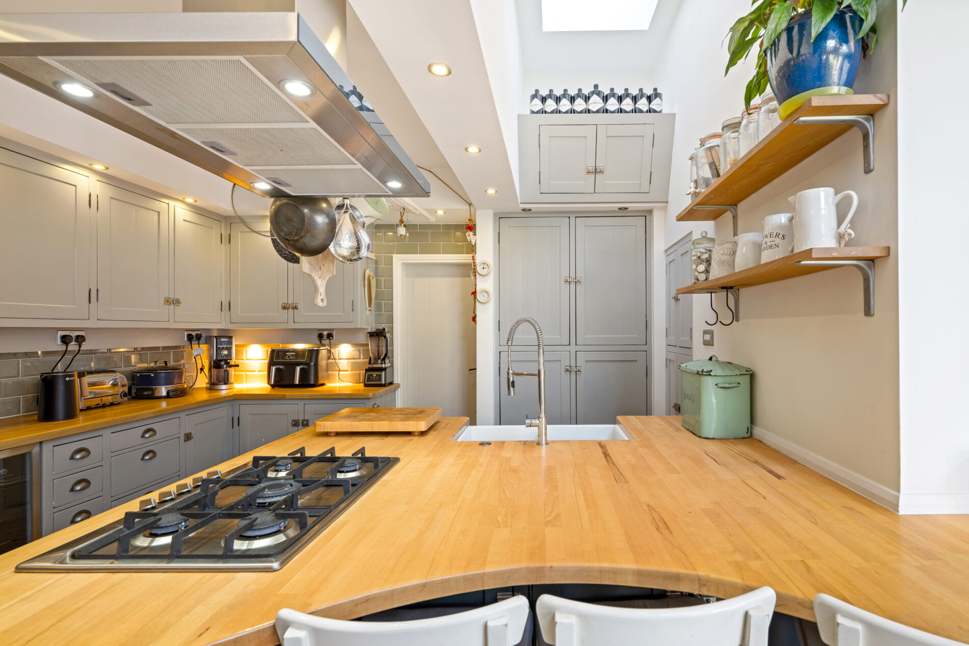 - Open-plan kitchen/dining area: Modern fitted units, Belfast sink, integrated appliances, and bifold doors to garden terrace