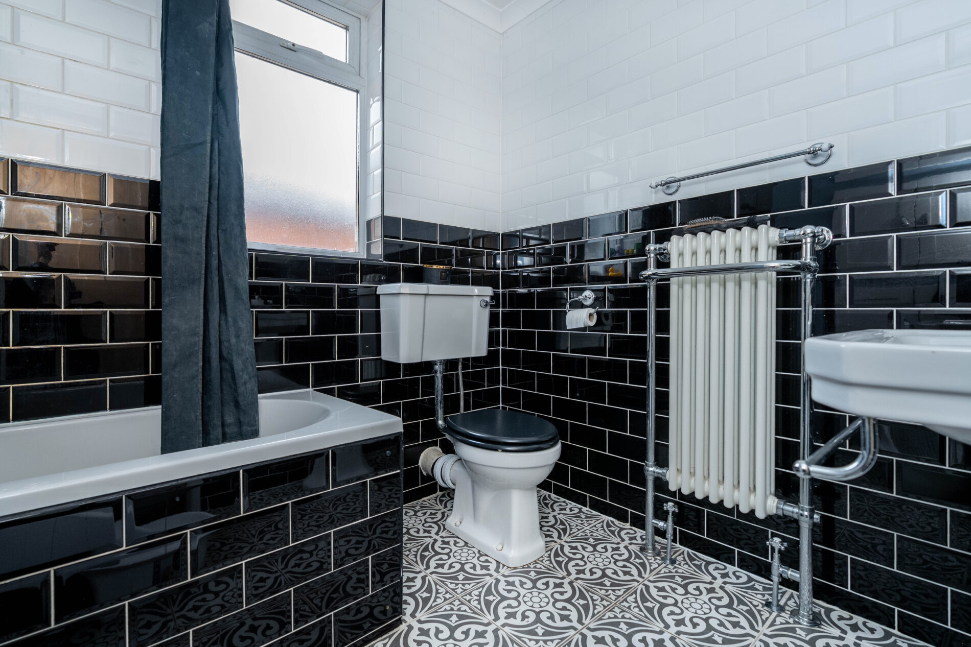 The family bathroom is modern and stylish, featuring a black and white tile design. It includes a radiator with a towel rail, and a frosted window to the side aspect allows natural light while maintaining privacy.