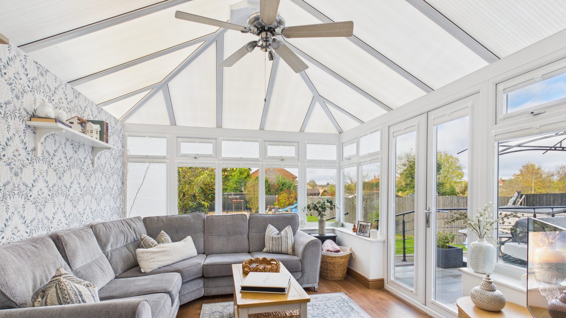 The garden room offers a bright and versatile extension of the living space, featuring the same elegant wooden flooring for a seamless transition from the living room. With a solid brick-built base and UPVC windows wrapping around half the room, this space is flooded with natural light while maintaining a cosy, private feel thanks to a fully brick-built wall on one side. Patio doors open directly onto the patio terrace, making this the perfect spot for relaxing with a view of the garden or entertaining family and friends.