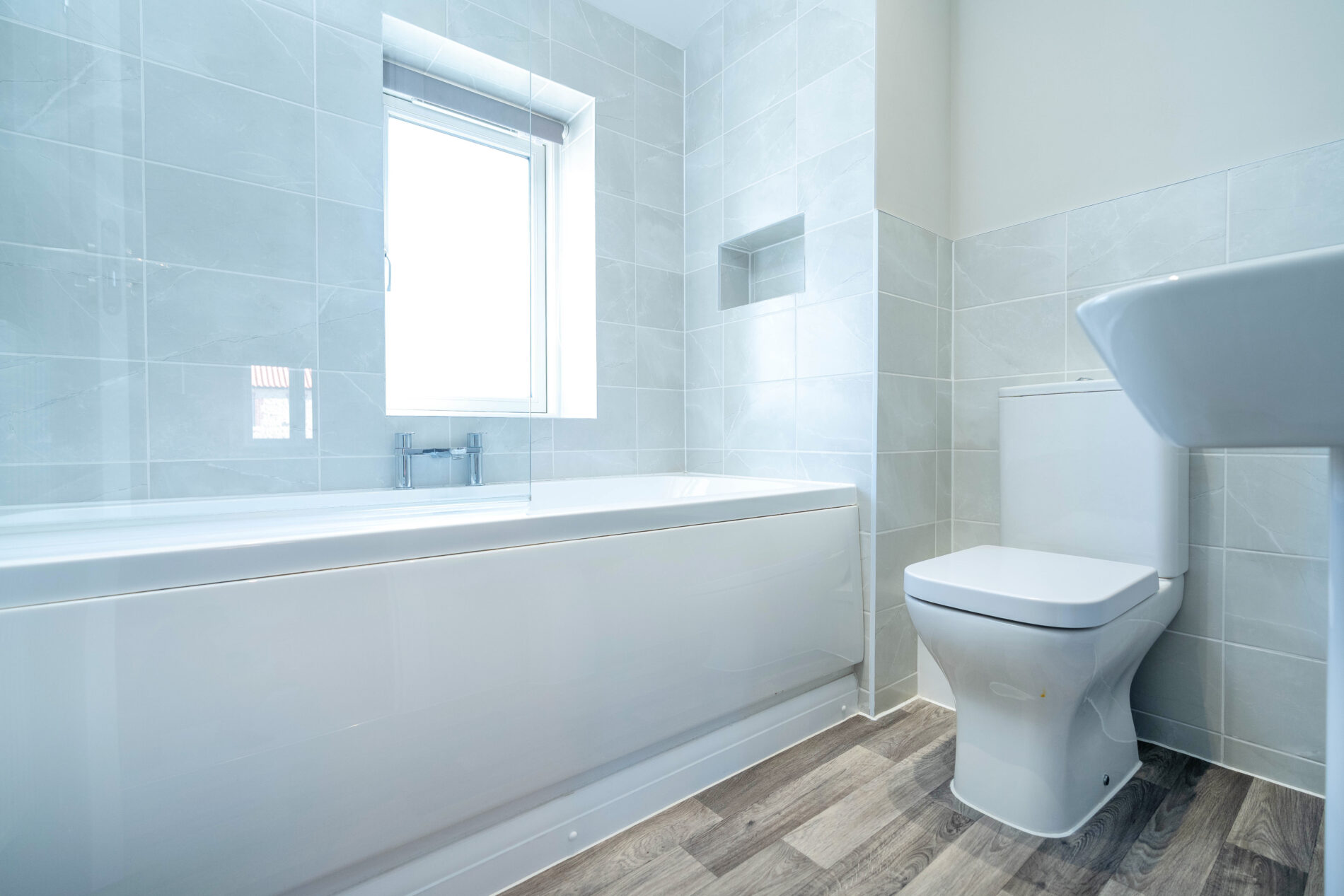 The family bathroom is finished to a modern standard with fully tiled walls. It includes a bath with an overhead shower, a sink, and a toilet. A frosted window to the front aspect provides natural light while maintaining privacy.