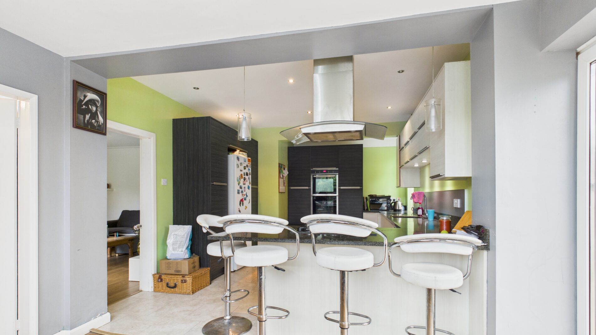 Step inside via the front door into the entrance hall. To your right is the secondary lounge with a bay window, providing a cosy and flexible space that could suit a variety of needs. To the left, a separate dining room offers the perfect setting for family meals and entertaining, and leads through to the main living room. The living room is a bright and comfortable space, featuring sliding doors that open directly onto the outdoor terrace—creating a seamless connection to the garden.