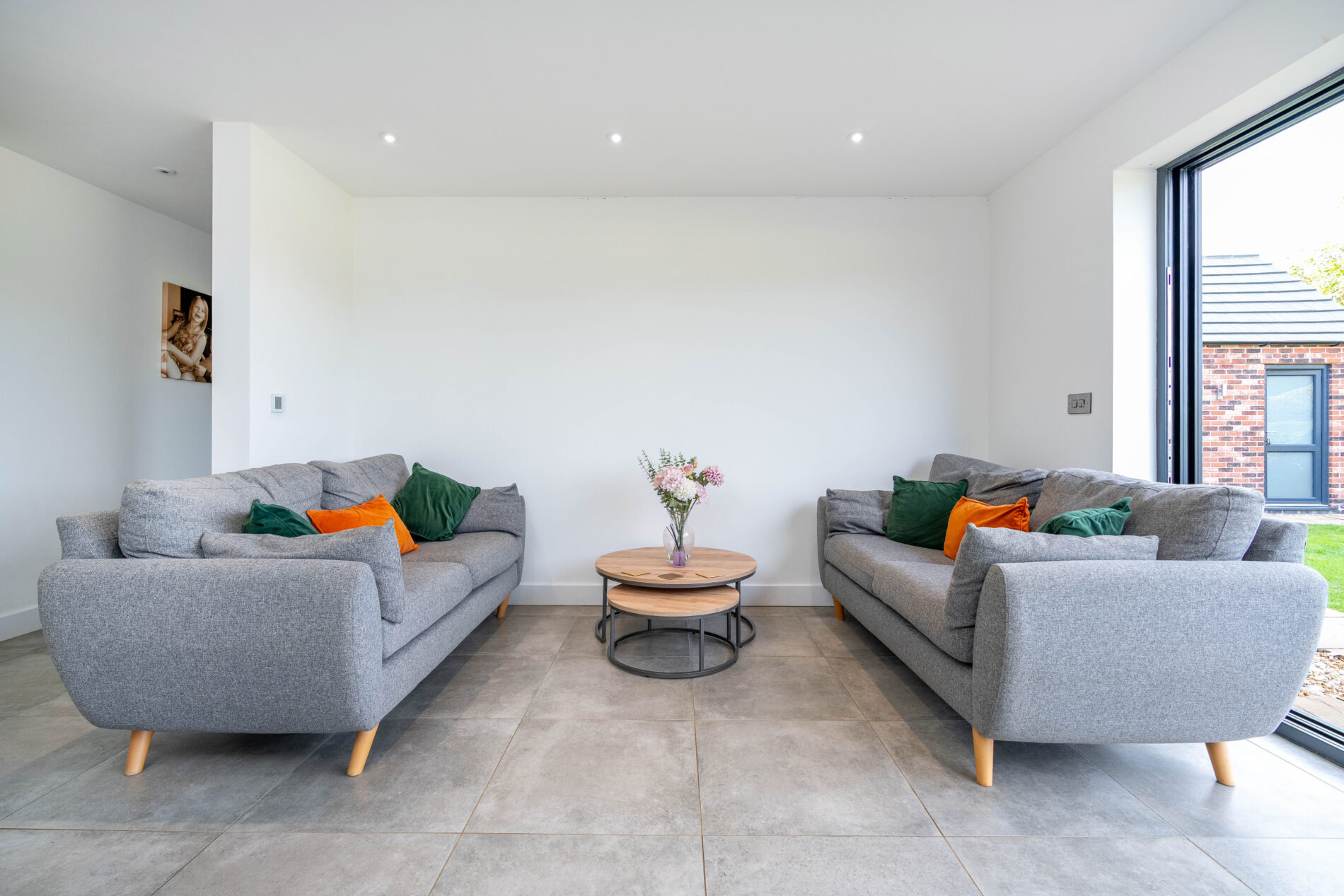 A stunning open-plan kitchen, lounge, and dining area, perfect for modern family living and entertaining. The kitchen features a large island with under-counter lighting, ample storage and cupboards, and a breakfast bar with a subtle overhang, ideal for casual dining. All appliances are Neff, including an integrated dishwasher, hob, two ovens, and an extractor hood, with a convenient boiler tap also included. The space flows seamlessly into the dining and living areas, all finished with a smart tile floor that continues from the hallway. Large 5m aluminium sliding patio doors open out to the garden, providing beautiful countryside views and a light, airy feel throughout.